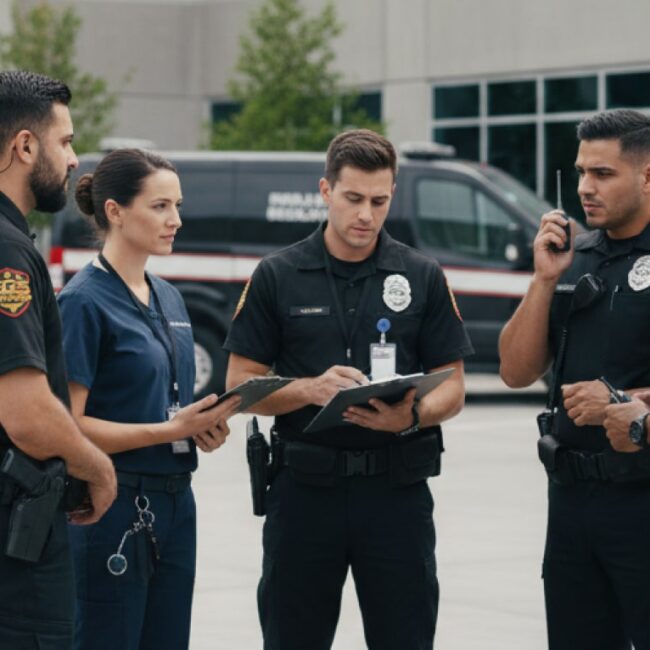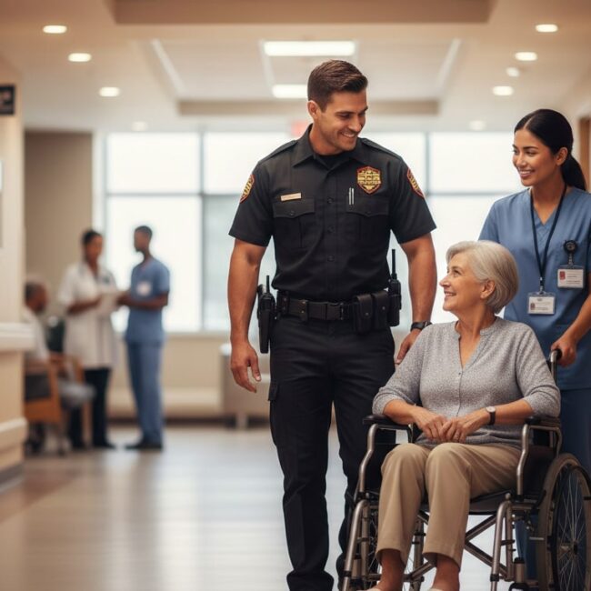 Healthcare settings require rapid intervention. Our officers respond to disturbances, behavioral incidents, and urgent security needs to restore order and assist medical personnel.